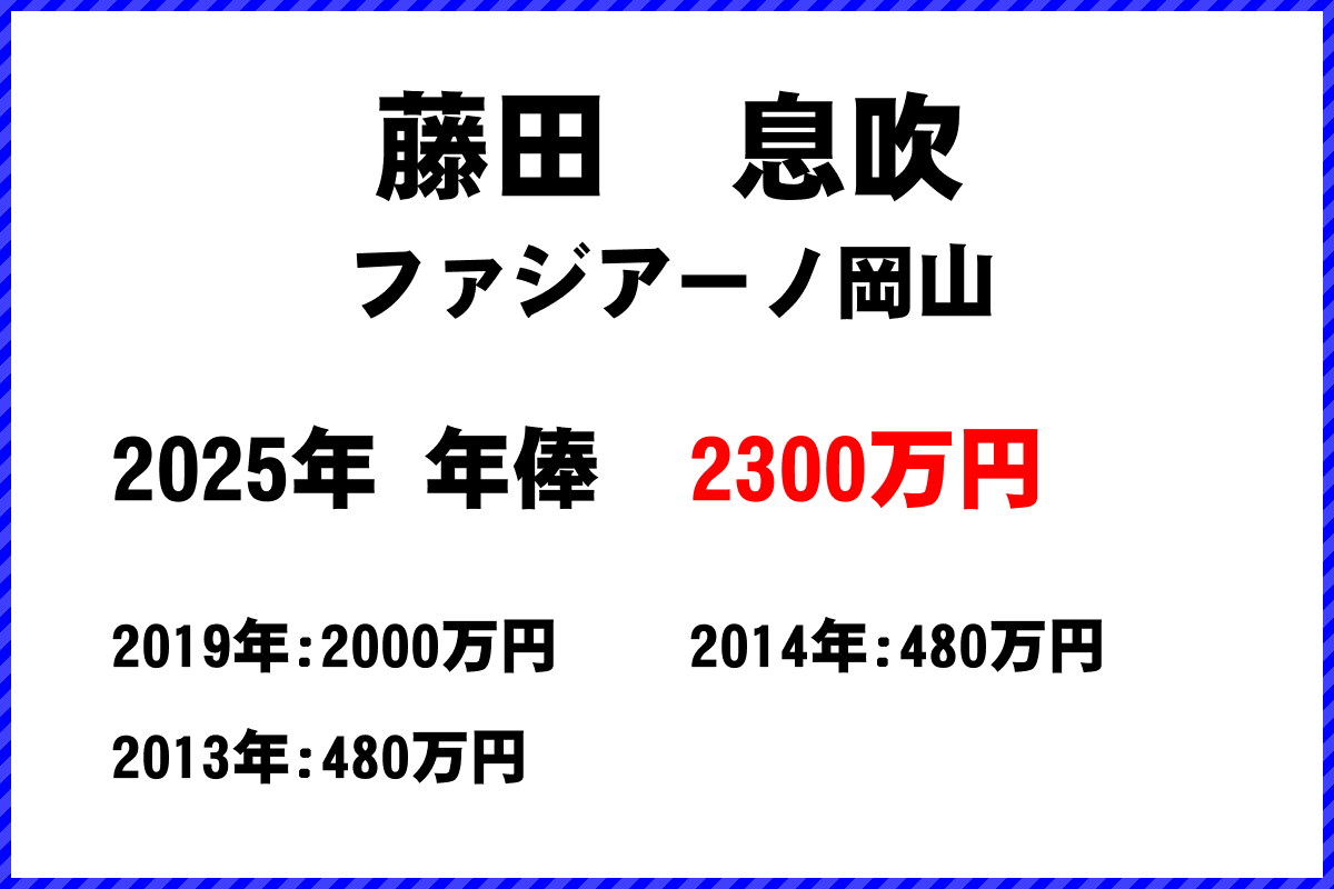 HOME> サッカーJリーグ チーム別年俸ランキング> ファジアーノ岡山 > 藤田息吹