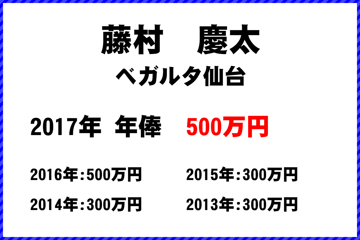 | 2017年 | ベガルタ仙台 | 藤村 慶太 | 24歳 | 500万円 |