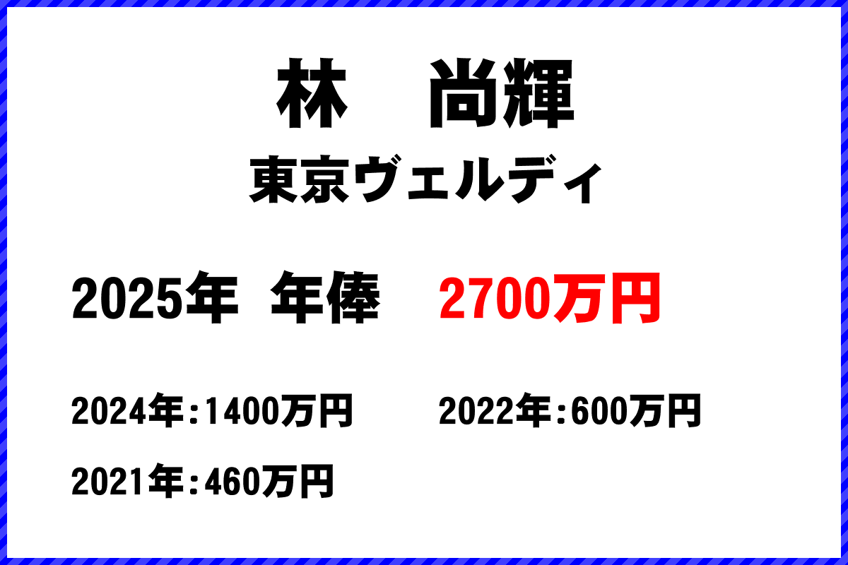 | 2025年 | 東京ヴェルディ | 林 尚輝 | 27歳 | 2700万円 |